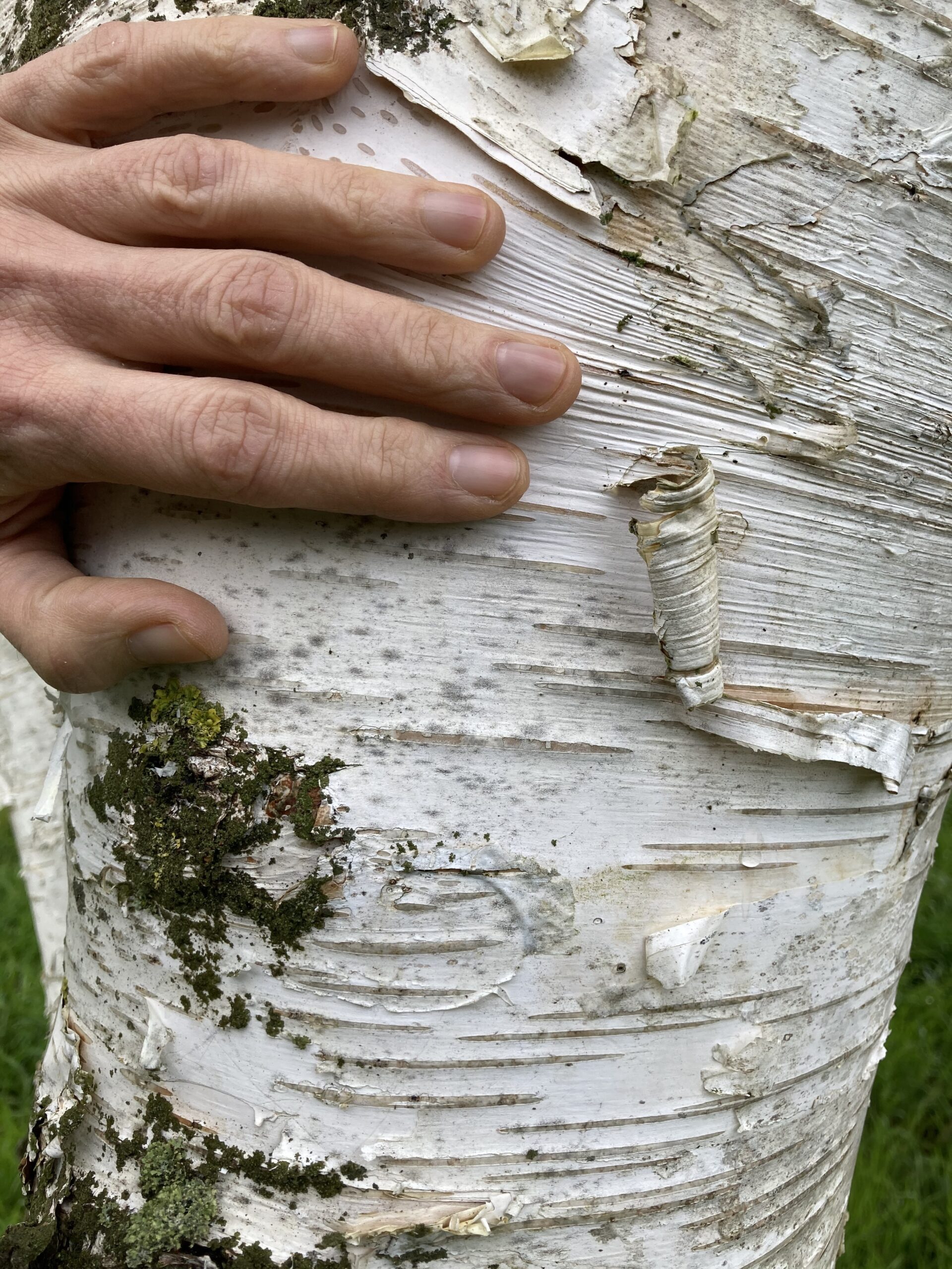 Then Covid appeared and the world went to hell in a handbasket. On a particularly dark day, I took my frazzled self to wander the garden and wound up in front of the birches. I remembered Eve all those years ago. I got quiet. I tried not to expect anything, not even to want anything except to be there. I didn’t want to make up pretty stories about the birch tree talking to me. I wanted to be in contact with something that was steadier than me in that moment, something that had access to deep earth and the stability it affords. I put my palm on the tree. My hand sat snugly on its curve. It felt solid and alive. I put my other hand on it. From there, my arms of their own accord went round the trunk. I leaned in. The bark was warm against my cheek. I felt shy and silly. What if bugs crawled in my ear? What if I got a rash? Torso to tree, I felt my heart beating, and something more – a muted drone, a vibration – that did not come from me. Tension dropped off me like sandbags from a hot air balloon. My legs came alive, as though they were trying to imitate the birch, reaching motionless towards the ground. At some point I broke the embrace, cupped my hand around the trunk once more, and then moved away, feeling markedly better.